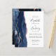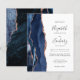 A borda esquerda deste elegante convite de casamento moderno apresenta um marinho azul de aquarela agate bordado com falso brilho rosa de ouro. O texto personalizável combina manuscrito, copperplate e fontes itálicas em cinzas de carvão em um fundo branco. O verso apresenta um design marinho de agate azul e rosa dourado correspondente.