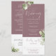 Um convite de casamento mauve tudo em um com folhas de verde botânico rústico e tipografia elegante. O convite inclui um cartão de RSVP que pode ser destacado e detalhes de informações para convidados. Criado por Thisisnotme©