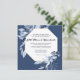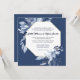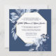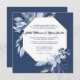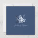Um quadro de ouro geométrico em forma elegante é rodeado por flores azuis nos cantos superior esquerdo e inferior direito. As flores são uma combinação muito bonito de flores azuis marinhos escuras com o azul-prateado mais claro. Os detalhes do casamento estão no centro em branco. O índigo profundo enquadra a parte externa do design geométrico e floral. A parte de trás do design também é azul-indigo e tem um arranjo floral no centro com os nomes dos casais de casamento abaixo.