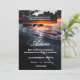 Torne sua celebração inesquecível com este convite de casamento dramático de pôr do sol na praia, apresentando uma mistura deslumbrante de ondas escuras do oceano, tons de pôr do sol brilhantes e tipografia elegante.