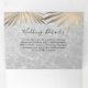 Simples, moderno, tropical, convite de casamento na praia de verão 3 em 1 tri-fold, com folhas de palmeira douradas, areia e ondas do oceano e foto do casal.