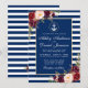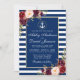 Convite de casamento náutico com listras azuis, floral marsala burgundy em aquarela e dourado