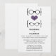 Convite de Casamento Óculos Geek extravagante e chique, apresentando um coração roxo ladeado por dois pares de óculos geek, um par masculino e um par feminino representando o noivo e a noiva. Este convite sofisticado e fora do comum é perfeito para o seu casamento nerd! Fácil de personalizar, basta adicionar os detalhes do seu grande dia nos campos de texto fornecidos. Clique no botão "Personalize" para encontrar opções adicionais de personalização.