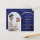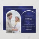 Um marinho de fundo azul, convite de casamento para a revista fotográfica. O fundo azul é irregular. Texto branco. Na frente: adicione sua própria foto de tamanho vertical. Personalize e adicione seus nomes e detalhes. Voltar: você pode adicionar mais texto se quiser. Vá para a ferramenta design e adicione à camada traseira. 1 folha = 1 convite impresso de borda a borda.