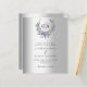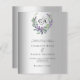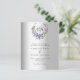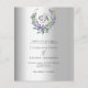 Um fundo de olhar mal prateado. Uma coroa floral feita de flores lavandas e de eucalipto verde de cor aquosa. Personalize e adicione suas iniciais, nomes e detalhes do monograma. Texto preto. 1 folha = 1 convite impresso de borda a borda.