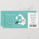 Um convite de casamento divertido e elegante em estilo de passagem de embarque/bilhete para casais que se casam no exterior, na bela ilha grega de Santorini, mostrada em uma silhueta de mapa branco sobre azul turquesa com corações de amor vermelhos, silhueta de avião e formato de coração girando. O verso tem muito espaço para detalhes extras e uma foto pessoal.