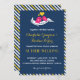 Convite vintage azul marinho, amarelo, rosa e branco com dois pássaros do amor cantando canção de amor. O verso do cartão é decorado com um padrão de listras fofo e divertido. Um design de convite doce e lindo para chá de noiva, chá de bebê, festa de aniversário, casamento, festa de noivado e muito mais. Personalize a redação para qualquer ocasião especial.