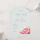 Este convite de casamento elegante apresenta um fundo verde menta pálido e suave que define um tom calmante e sofisticado. O design inclui uma grande e detalhada ilustração de uma flor de peônia rosa no lado direito, adicionando um toque de romance e beleza natural. Fontes de letra personalizáveis destacam os nomes do casal, enquanto fontes serifadas limpas fornecem detalhes do evento, garantindo clareza e elegância. O layout geral equilibra texto e imagens harmoniosamente, criando uma atmosfera convidativa perfeita para uma celebração formal.