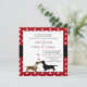 Convite de casamento fofo feito em um vermelho divertido, com fundo de bolinhas brancas. Uma área de texto branca sobre o fundo é decorada, com um dachshund marrom e um preto, com corações entre eles. Todo o texto é personalizável para atender às necessidades do seu casamento. Convite de casamento adorável para amantes de cães para o casal divertido.