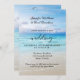 Um convite de casamento com uma pintura moderna de uma praia em cores vibrantes. No verso há um modelo de código QR para os detalhes do seu site e para confirmar presença.