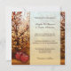 Um convite de casamento colorido com um pomar e maçãs em tons ensolarados de ocre e vermelho.