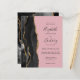 A borda esquerda deste elegante convite de casamento moderno apresenta uma coloração aquosa preta, borda agitada, aparada com falso brilho dourado. O texto personalizável combina manuscrito off-black, fontes copperplate e itálico em um plano de fundo rosa. O verso apresenta um design de agate preto e dourado correspondente.