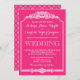 Convite de casamento em estilo vintage e rústico com fundo rosa vibrante e fonte branca. Decorado com uma borda de flores Victorianas na frente. A parte de trás do cartão é decorada com um padrão de diamantes vintage. Design clássico para o seu dia especial. Personalize a fonte e o texto para qualquer ocasião, como chá de noiva, chá de bebê, festa de noivado, despedida de solteira, festa de aniversário e mais.
