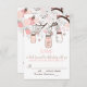 Ilustrações caprichosas de potes de pedra cor-de-rosa e cordas de coração penduradas em uma árvore com dois pássaros amorosos marrons cercados por uma variedade de flores cor-de-rosa e marrons. É perfeito para casamentos de verão, primavera e ao ar livre.