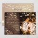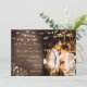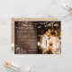 Celebre seu amor sob o brilho das luzes de corda com este convite de casamento de madeira rústica apresentando ilustrações florais douradas românticas, luzes cintilantes e uma foto personalizada do casal. Um código QR conveniente liga os convidados diretamente ao seu site de casamento ou página de RSVP. Fontes de letra elegantes e tons terrosos tornam-no a escolha perfeita para casamentos de outono ou inverno com um sentimento rústico moderno e aconchegante.