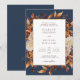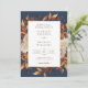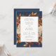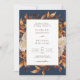 Convite de Casamento Folhas de Outono em Terracota Azul Marinho. Este elegante convite de casamento apresenta belas folhas de terracota, laranja queimada e cobre pintadas à mão em aquarela, dahlias creme e bege, e belas rosas enferrujadas e marrons em um fundo azul marinho, perfeito para um casamento de outono! O verso do convite tem um belo ramo de folhas com o monograma dos noivos. Encontre itens correspondentes na Coleção de Casamento Romance de Outono Azul Marinho.