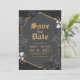 Anúncio de Save the Date Darkly elegant Gothic Swirl Roses com um floreio espiral e um trio de rosas vermelhas profundas em um fundo de papel texturizado falso. Este save the date é perfeito para o casal que planeja um casamento gótico não tradicional. Fácil de personalizar, basta adicionar os detalhes do seu casamento nos campos fornecidos. Clique no botão "Customize It" para encontrar opções adicionais de personalização.