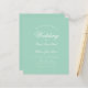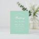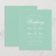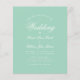 Um convite de casamento simples e minimalista dentro do orçamento. Tem apenas texto branco em fundo verde menta. A palavra Casamento e os nomes são escritos em uma caligrafia elegante.