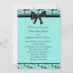 Convite de casamento 5x7 com desenho de videira em redemoinho azul turquesa e preto envolto em um lindo laço preto