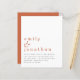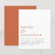 Convite de Casamento em Terracota com Texto Simples. Uma alternativa de preço acessível com tamanho MENOR 4,5” x 5,6”. Disponível em PAPEL CARTÃO 110 lb SEMI-BRILHANTE, que é a opção padrão (mais grosso para convites), OU PAPEL MAIS FINO 80 lb COM ACABAMENTO SEDA (ideal para inclusões). Os envelopes são opcionais e têm um tamanho ligeiramente maior que o cartão. Simples e informal, seus primeiros nomes aparecem em letras minúsculas elegantes e os detalhes abaixo. Personalize facilmente o texto.