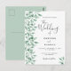 Um convite de casamento botânico em branco e verde. Um fundo branco chic na frente. Decorados com verde de cor aquosa, folhagem, primaveras. Escrita moderna e extensa, tipografia com o texto: O casamento de... Modelos para seus primeiros nomes e detalhes do casamento. Texto das cinzas escuras. Fundo: fundo verde claro. Dica: Se você não quiser que pareça um cartão postal, clique em personalizar, vá para o verso e remova o divisor e o carimbo de posto.