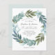Esta é uma design de folhagem rústica organizada em uma coroa para conter suas informações únicas de casamento. A ilustração consiste em elementos botânicos no estilo aquarela e num esquema de cores de verdes-sábios e azuis poeirentos suaves. Fácil de editar modelo.