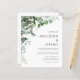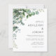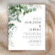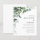 Este convite de casamento moderno apresenta um arranjo de aquarela de folhagem de eucalipto arqueando sobre o canto superior esquerdo. Edite o texto sem serifa em cinza carvão com os nomes do casal e detalhes do casamento em um fundo branco. O verso é branco sólido. OBSERVAÇÃO: Os envelopes não estão incluídos automaticamente com esses convites de orçamento, então por favor lembre-se de escolher a opção "envelopes brancos"!