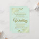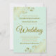 Este convite de casamento simples, mas elegante, apresenta letras em escrita dourada sobre um fundo verde pálido ou cor de menta neo. O design é discreto, mas os cantos apresentam uma filigrana floral ornamentada dourada com ondulações e enfeites. O texto é formal e tradicional, mas o design elegante torna este convite apropriado para qualquer casamento.