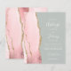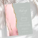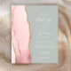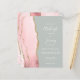 A borda esquerda deste convite de casamento moderno e elegante apresenta uma borda de água-forte de ágata cor-de-rosa salmão, aparada com brilho dourado falso. O texto personalizável combina escrita à mão branca, copperplate e fontes itálicas em um fundo verde sage pálido. O verso apresenta um design de ágata cor-de-rosa e dourado correspondente.