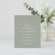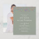 Um convite de casamento econômico com confete colorido arco-íris fica acima dos detalhes do seu convite de celebração de casamento especial definido em tipografia branca moderna e elegante em um fundo verde sage. O verso apresenta sua própria foto especial. Projetado por Thisisnotme©