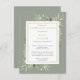 Um convite de cartão postal personalizado e elegante para celebração da vida com folhagem botânica em aquarela sobre um fundo verde salvia. Criado por Thisisnotme©