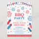 Convite de festa de churrasco festivo do Dia 4 de Julho com moldura, bandeiras e fogos de artifício isolados em fundo branco. Design para convites do Dia da Independência Americano. Tipografia personalizável em vermelho e azul.