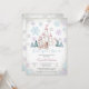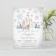 Celebre um momento mágico com este convite de chá de bebê encantador de conto de fadas. Com uma pitoresca representação de um castelo com telhados cor-de-rosa, uma carruagem real e flocos de neve pastéis em azul, roxo e prata, este design captura um tema sonhador de um país das maravilhas de inverno. Perfeito para homenagear as futuras mamães, este cartão elegante combina o charme dos contos de fadas com a beleza da estação, tornando-o ideal para celebrações inspiradas em princesas. Personalize com seus detalhes para criar um souvenir único que os convidados vão adorar.