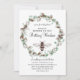 Um convite de chá de bebê único com tema de mamãe abelha, apresentando abelhas e uma grinalda floral botânica de eucalipto e algodão. Padrão de favo de mel no verso do convite.