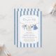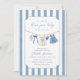 Celebre a chegada alegre da sua menina com o nosso convite de chá de bebê "Blue Jean Baby". Este cartão charmoso apresenta detalhes de denim suave como roupas de bebê fofas e listras modernas como fundo.