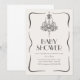 Este convite caprichoso de vintage para chá de bebê apresenta uma moldura delicada e elegante que contorna todo o cartão, dando um toque atemporal e charmoso. No topo, um lustre antigo lindamente ilustrado pende graciosamente, transmitindo um ar de sofisticação e nostalgia. No centro, os detalhes da festa são apresentados em uma fonte elegante com amplo espaço para edição fácil. O design geral exala uma atmosfera suave e encantadora que combina perfeitamente o charme vintage com um clima caprichoso e comemorativo, ideal para uma reunião sofisticada de chá de bebê.