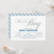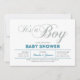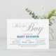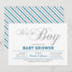 Celebre um dia especial para o seu querido com este convite de chá de bebê moderno! Este design apresenta tipografia elegante "É um menino" em textura de prata brilhante e azul-teal.