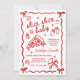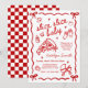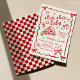 Celebre seu pequeno pedaço no caminho com este convite de chá de bebê temático de pizza vermelho e branco retrô italiano, apresentando um padrão xadrez clássico, detalhe de laço coquette moderno e um estilo "Slice Slice Baby" trendy. Este convite de chá de bebê vermelho e branco é perfeito para um chá de bebê com tema de pizza party, celebração com tema italiano, chá de bebê para foodies ou encontro retrô moderno. Projetado com uma estética lúdica e elegante, este convite de chá de bebê de pizza funciona lindamente para chá de bebê de menino, menina ou neutro em termos de gênero e combina perfeitamente com decoração xadrez, gráficos de fatias de pizza e detalhes de festa inspirados em fast food. Ideal para um chá de bebê casual de brunch, chá de bebê de casal, celebração de sprinkle ou entrega especial, este convite de tema de pizza trendy combina charme italiano vintage com um toque contemporâneo divertido