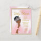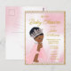Convite de chá de bebê da princesa preta com adorável bebê princesa com cabelo afro fofo com coroa de diamantes e capa em um lindo fundo rosa e dourado. Este cartão postal de convite de chá de bebê da princesa é facilmente personalizado com os detalhes do seu evento.
