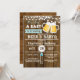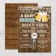 Convite de chá de bebê de menino com tema de cerveja e churrasco em fundo de madeira rústico.