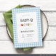 Prepare-se para acender a grelha e celebrar a chegada do seu pequeno com este convite de chá de bebê divertido e casual para casal, Baby Blue Gingham Couple Baby Q! Com um fundo xadrez divertido, um delicioso espetinho e tipografia em negrito, este design é perfeito para casais que buscam uma celebração memorável com tema de churrasco.