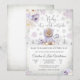 Celebre a chegada do seu pequeno com este encantador convite de chá de bebê com tema de inverno, apresentando um ursinho fofo vestido de roxo cercado por flocos de neve e flores pastéis. Perfeito para uma reunião sazonal aconchegante, este design elegante define o tom para uma celebração alegre. Com seu fundo de paisagem nevada e tipografia elegante, é uma escolha ideal para futuros pais que desejam um convite festivo e caloroso. Ótimo para chás de bebê de inverno, este cartão combina capricho e sofisticação para deliciar os convidados e criar memórias duradouras.
