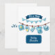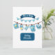Este convite apresenta as palavras "Chá de Bebê É um Menino" em uma fonte de impressão única com letras brancas e fundo azul com roupas em uma linha neste tema e estilo de menino. Impresso em um papel clássico, completo, com 17,5 pt de espessura e acabamento matte não revestido com textura de casca de ovo, feito e impresso nos EUA com "É um Menino" impresso no verso.