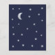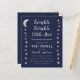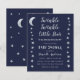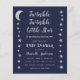 Um convite de chá de bebê econômico com estrelas e lua nas bordas esquerda e direita. Tem fundo azul-marinho. O texto é cinza claro e branco. O título "Twinkle Twinkle Little Star" e o nome são escritos em uma fonte manuscrita dourada, com estrelas pequenas no i das palavras "Twinkle".
