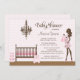 Este convite para chás de fraldas de meninas 5x7 tem um padrão de ziguezague branco e cor-de-rosa suave ao fundo. À esquerda, há um candelabro marrom elegante pendurado sobre um berço de bebê. Ao lado do berço estão três caixas cor-de-rosa com arcos e um ursinho de pelúcia rosa. À direita, há uma elegante mãe grávida segurando um vestido de bebê rosa. No meio, você pode personalizar todas as informações do seu partido. Alguns gráficos são de Olillia no MyGrafico.
