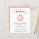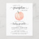 Um convite de chá de bebê neutro em relação ao sexo, fofo, alegre e econômico, apresentando "Um Pequeno Abobrinha Doce Está a Caminho" escrito em uma mistura de tipografia moderna cinza suave e um script elegante, e uma aquarela de abóbora laranja pastel. Você pode personalizar o nome da mãe e os detalhes do chá em tipografia cinza simples.