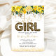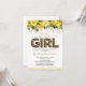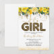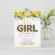 Convites de chá de bebê fofos com fundo branco simples, brilho bonito, flores em aquarela amarela elegante, a frase "é uma menina" em uma fonte script e balão com estampa de leopardo, e um modelo de celebração de bebê que é fácil de personalizar.