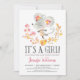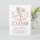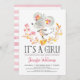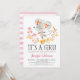 É uma Menina! Convite de chá de bebê de ratinho rosa fofo. Fundo de aquarela e verso listrado.