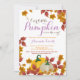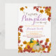 Convite de chá de bebê menina roxo abóbora de outono. Convite de chá de bebê de outono. Floral de abóbora em aquarela com flores e folhas. Roxo e laranja. Para personalização adicional, clique no botão "Personalize" e use nossa ferramenta de design para modificar este modelo.