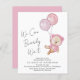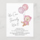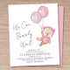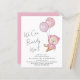 Convite de chá de bebê menina econômico no estilo boho com uma ilustração de aquarela de um urso teddy rosa flutuando com balões, e "Mal podemos esperar" em uma caligrafia manuscrita.